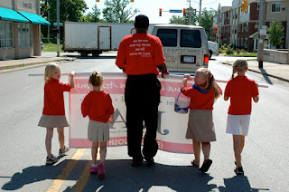 So today, Juneteenth, there was a parade in Des Moines and JCA had students walk and a van drive in it. It had been quite stormy the past few days, but the sun was bright and shining this morning. We all wore red for the school colors and walked about 15 blocks, throwing candy and waving to people. I'll admit- I felt pretty white :-) There weren't as many kids on the route as we expected, but we still threw out lots of candy. I love parades in Iowa. They have always been a big part of summers for me here.
